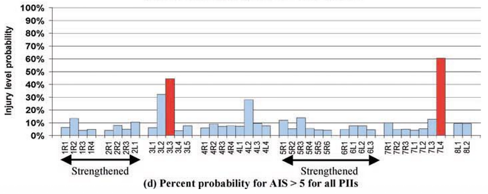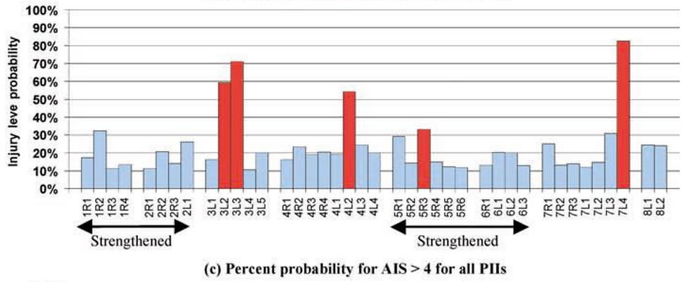La Tabla 4 muestra una correlación de aumento de la frecuencia de lesiones graves en los vehículos de serie en comparación con los vehículos con jaula antivuelco, con el doble de valores Ni j > 1,0 en los vehículos de serie. Además, cuando se analizan los datos brutos se observa que para los cuatro valores de Ni j superiores a 1,0 experimentados en los vehículos con jaula antivuelco, el valor medio de Ni j es de 1,20. En contraste con esto, la media para los ocho PII de vehículos de producción con Ni j superior a 1,0 es de 1,64. Esto apoya aún más la opinión de que los techos más débiles presentan un mayor riesgo de lesiones graves para los ocupantes en colisiones con vuelco.